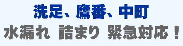 洗足、鷹番、中町での水の困った即解決!急な水道トラブルに緊急でかけつけ訪問し、蛇口の水漏れ、トイレ詰まり、排水の溢れ、タンクの故障など修理いたします。