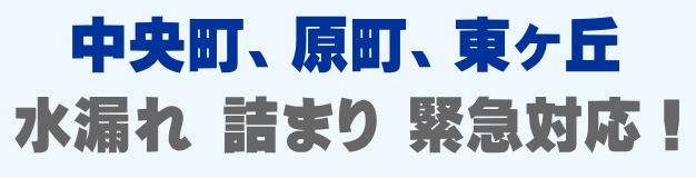 中央町、原町、東ヶ丘での水の困った即解決!急な水道トラブルに緊急でかけつけ訪問し、蛇口の水漏れ、トイレ詰まり、排水の溢れ、タンクの故障など修理いたします。